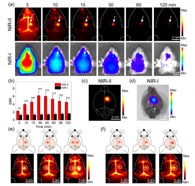 脫毛后,將小鼠置于俯臥位,并通過尾靜脈注射MBs-ICG或游離ICG(ICG劑量=1.5mg/kg)。使用NIR-II熒光成像系統(tǒng)(以不同的時間間隔獲取具有完整顱骨的腦血管結構的NIR-II熒光圖像)。