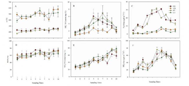四種處理下(A)總含水量(B)NH4+-N(C)N2O通量(D)充水孔隙度(E)NO3--N以及(F)NH3通量的時間變化。