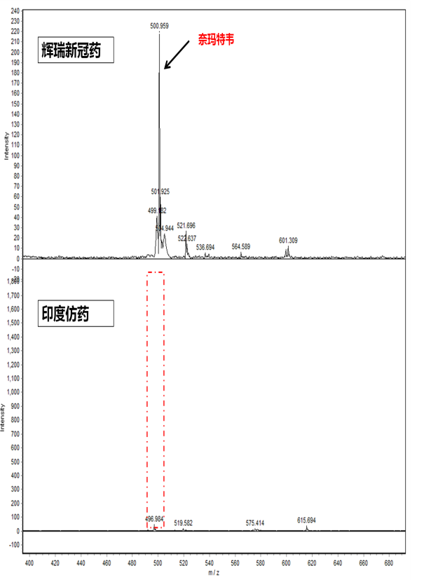 首先對兩種藥中是否含有抑制新冠病毒在人體內(nèi)增殖的成分—Nirmatrelvir (奈瑪特韋)進(jìn)行了檢測。通過快速、簡單的樣本前處理, 然后開始點(diǎn)靶、干燥和上機(jī)檢測。我們在輝瑞新冠特效藥中很快就檢測到了奈瑪特韋的離子峰(m/z=499.54Da),然而在我們所檢測的印度仿制藥中卻未檢測到該質(zhì)量數(shù)的離子峰,這一結(jié)果說明此藥盒中的奈瑪特韋片不含Nirmatrelvir這一治療新冠的關(guān)鍵成分。