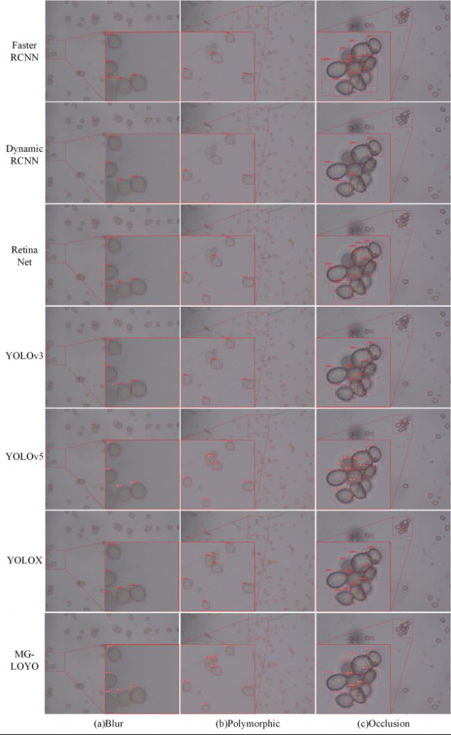 實驗結(jié)果表明:提出的MG-YOLO能夠提升灰霉病菌孢子的檢測精度,最終檢測精度達(dá)到0.983,每張圖像的檢測時間為0.009s。MG-YOLO的灰霉病菌孢子檢測結(jié)果優(yōu)于Faster R-CNN、RetinaNet、YOLOv3、Dynamic R-CNN、YOLOv5和YOLOX。檢測結(jié)果的可視化如圖2,MG-YOLO能夠有效應(yīng)對模糊、小目標(biāo)、多形態(tài)、遮擋場景下的孢子檢測問題,表明論文提出的方法具有魯棒性,能夠?qū)崿F(xiàn)不同情況下的灰霉菌孢子的高精度檢測。
