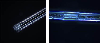 光纖的纖芯直徑在幾微米到幾十微米之間,細(xì)小脆弱,某條光纖的結(jié)構(gòu)是否有損壞,加工過的的光纖的橫斷面的結(jié)構(gòu)是否符合老師預(yù)期的要求,我們用肉眼難以檢測出來,因此,需要更好的檢測手段。明美金相顯微鏡MJ33用于光纖的檢測,視場大、成像清晰且對比度好。同時(shí)配備透反射光源、兼容明場、暗場和偏光三種不同的觀察方式對光纖結(jié)構(gòu)進(jìn)行觀察檢測,檢測效果更佳。并且搭配明美2100萬高分辨率、 4/3英寸大靶面芯片的顯微數(shù)字相機(jī)MSX11,針對顯微鏡拍攝場景特別優(yōu)化,準(zhǔn)確還原光纖在不同觀察方式下的精細(xì)結(jié)構(gòu)和真實(shí)色彩,光纖結(jié)構(gòu)細(xì)節(jié)清晰可見。