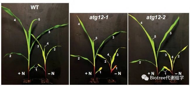 氮饑餓的玉米表現(xiàn)出強烈的生長抑制,但野生型尚未顯示加速葉片衰老,而atg12突變體明顯衰老。