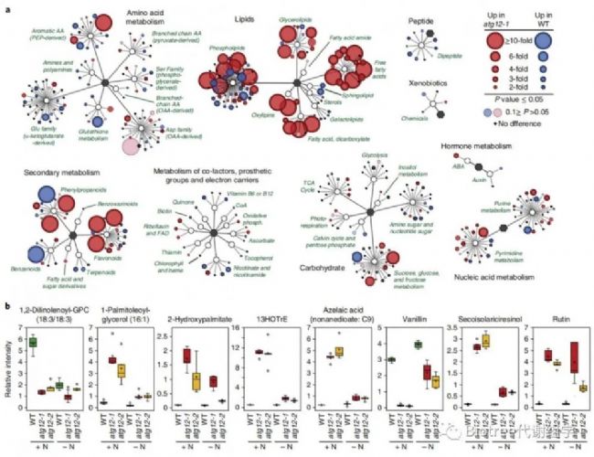 圖4.a.基于代謝功能/途徑的417個代謝物網(wǎng)絡圖。b.受atg12突變影響的脂質(zhì)及分解中間體和次級代謝相關化合物的箱式圖。