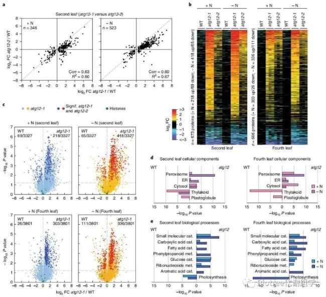 圖7.突變體在富氮和饑餓條件下顯著改變玉米蛋白組。a.atg12-1和atg12-2突變體同樣影響玉米蛋白質(zhì)組。b.熱圖顯示在+ N或-N中生長的WT與atg12突變體的差異蛋白。c.火山圖顯示atg12-1與WT葉中單個蛋白質(zhì)的優(yōu)先積累。d、e.圖c中差異蛋白的特定GO功能的富集/消耗,d.“細胞成分”的富集。e.“生物過程”的富集。Cat.:分解代謝。