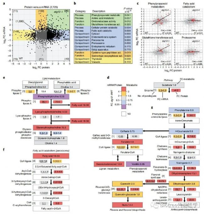 圖9.轉(zhuǎn)錄組和蛋白質(zhì)組比較鑒定了受轉(zhuǎn)錄和/或自噬影響的過程。a.散點圖顯示了atg12-1與WT的蛋白質(zhì)和mRNA豐度變化之間的關系。b.圖a中有色區(qū)域?qū)闹饕狦O功能。c.散點圖顯示atg12-1與WT植物中特定GO功能對應的轉(zhuǎn)錄物和蛋白質(zhì)的相對豐度間的相關性。d、e、f、g.簡化的代謝流程圖描述了在高氮條件下第二片葉子中atg12-1與WT的代謝物、相關蛋白及其相應mRNA的變化。e.脂質(zhì)代謝主要途徑的流程圖。f.脂肪酸分解代謝的β-氧化途徑流程圖。g.苯丙烷、木脂素、類黃酮和花青素合成路線的組合流程圖。沒有顏色/沒有值的隔室表示未檢測到的代謝物/ mRNA /蛋白質(zhì)。