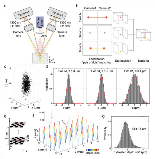 1、系統(tǒng)設計和表征:擬議系統(tǒng)的示意圖表示如圖1a所示。外照射由855 nm激光二極管提供,而兩個相同的SWIR相機用于以立體視角±20°的雙視角模式收集發(fā)射的熒光信號。對于這種布置,位于不同深度的熒光目標被投射在兩個傳感器上的不同位置。這些投影中的每一對點都可以對分離的熒光發(fā)射器進行3D定位。具體來說,點之間的橫向偏移,即所謂的視差,編碼發(fā)射器在感興趣體積(VOI)中的軸向位置,根據立體視覺參數對其進行三角測量(圖1b)。利用流動熒光微滴的稀疏性,在相機采集的每張圖像中以亞像素分辨率定位其中心。接下來是搜索圖像校正后位于相似水平坐標的匹配點對。通過3D跟蹤算法建立的流動目標軌跡疊加,最終呈現(xiàn)出體積圖像(圖1b)。與其他基于定位的成像方法一樣,如光激活定位顯微鏡或隨機光學重建顯微鏡,所提方法的理論分辨率受到定位精度的限制。后者是通過在平面顯微載玻片上以40 Hz幀速率渲染靜態(tài)微液滴的雙視圖圖像堆棧來估計的,總采集時間為50 s。液滴局部位置的變化有助于估計最大可實現(xiàn)的分辨率(圖1c)。請注意,微滴的尺寸小于光學系統(tǒng)的衍射極限,即在當前設置下為≈27.7μm,也就是說,它可以有效地被認為是理想的點源。假設局部點的分布由高斯函數很好地近似,則相應的全半寬最大值 (FWHM) 在x、y和z方向上分別為1.3、1.5和3.4 μm(圖1d)。請注意,定位精度取決于信噪比(SNR),對于較大的微液滴,信噪比更高。通過獲取平面棋盤圖案的明場圖像堆棧,進一步驗證了整個FOV的系統(tǒng)性能,該圖像使用電動載物臺在3 mm深度范圍內沿z軸以5μm步長平移(圖1e)。黑白方塊之間的交叉點在每個深度上定位,在圖1f中繪制為具有顏色編碼深度的點云。圖1g所示的相鄰平面之間估計深度偏移的直方圖的平均值和標準偏差(SD)為4.8±1.4μm,與掃描步驟相匹配。為了提高深度靈敏度,需要擴大立體視覺角度,以增加樣品在深度方向上的給定偏移引起的雙視圖之間的差異但是,增加角度會導致由每個相機的景深定義的兩個體積之間的傾斜,從而導致雙視圖提供的體積之間的重疊減少。為了平衡深度靈敏度和有效成像體積,因此選擇了±20°立體視角。這些表征測量表明,我們的方法原則上可以達到比毛細血管尺寸更好的空間分辨率,毛細血管尺寸對應于可以通過血液中的粒子跟蹤成像的最小結構。