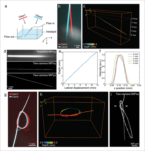 2、散射介質中的三維成像性能:我們的方法在散射介質中可視化結構的能力首次在組織模擬成像中得到評估。作為原理的初步證明,我們對浸入1.2%脂質內溶液(圖2a)的微管進行成像,并將其傾斜,使模型內部的深度沿y軸呈恒定梯度增加。選擇脂質內濃度來模擬生物組織中散射系數的降低。通過將微液滴(直徑<20μm)以恒定流速注入管道進行體積成像。以18 Hz幀速率記錄了總持續(xù)時間為1分鐘的雙視圖圖像堆棧。通過疊加所有記錄的幀并用青色和紅色疊加在一起來獲得每個相機的寬場等效圖像(圖2b)。沿著深度梯度,寬場等效圖像的信噪比和分辨率迅速惡化,而雙視圖之間的位移表現(xiàn)出預期的線性增加。通過立體視覺定位單個流動微液滴的3D位置,重建了微管的體積視圖(圖2c)。圖2d顯示了相機1的2D寬場等效圖像與使用定位方法重建的側視圖之間的比較,說明后者明顯提高了散射介質中可實現(xiàn)的空間分辨率。正如預期的那樣,還觀察到計算的深度與沿y軸的橫向位移之間的近似線性關系(圖2e)。此外,在脂質內模型(圖2f)中,不同深度重建的微管的線條輪廓在4 mm深度幾乎不受影響,證實了所提出的系統(tǒng)的深層組織成像能力。我們用復雜的血管形狀樣品進一步評估了我們方法的3D性能。具體來說,將形成結圖案的管道浸入1.2%脂質內溶液中的≈2毫米深度。在注射微液滴后,使用與直微管相同的參數進行雙視圖記錄。通過疊加所有采集的幀來呈現(xiàn)來自每個相機的寬場等效圖像如圖2g所示,用青色和紅色編碼。在重建的圖像中清楚地解析了結的3D形狀(圖2h)。此外,微管重疊段的239.4μm深度差,與其外徑非常匹配,可以從側視圖區(qū)分開來(圖2i)。