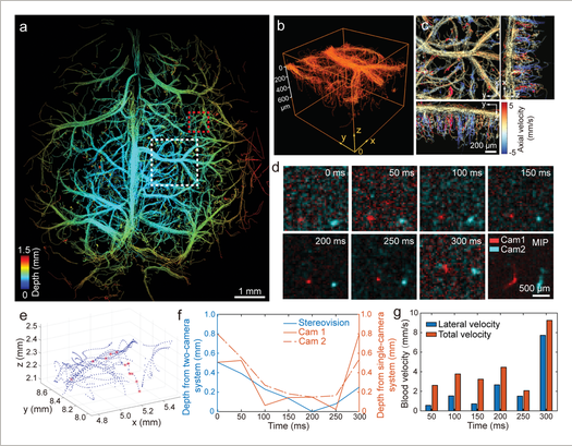 3、大腦微循環(huán)的體內經顱圖譜:接下來,我們展示了所提出的方法在體內小鼠皮質脈管系統(tǒng)經顱成像的能力。通過3D追蹤流動的微液滴獲得深度分辨微循環(huán)圖(圖3a)。請注意,從圖像中心到邊緣觀察到的深度梯度是由于小鼠大腦的曲率(圖3a)?梢娚疃冗_600μm的穿透小動脈和小靜脈,如所選VOI的放大視圖所示,大約Bregma -1.5 mm(圖3b)。來自三個視圖的相同VOI的血流速圖也通過微滴跟蹤呈現(xiàn)(圖3c)。圖3d顯示了通過選定VOI穿透血管跟蹤的單個微液滴的代表性延時雙視圖圖像。首先,兩個圖像中液滴的兩個投影之間的間隔距離減小,然后略有增加,這與局部3D位置觀察到的深度變化一致(圖3e)。作為交叉驗證,通過考慮局部光斑尺寸對深度相關光擴散的依賴性,也使用單相機估計了同一微液滴的深度。雖然我們的雙相機系統(tǒng)(基于立體視覺)和單相機系統(tǒng)(基于擴散)的深度估計總體上非常一致(圖3f),但使用單相機系統(tǒng)在測量的深度中觀察到更大的波動,這可能是由于生物組織的未知和異質散射特性。我們的技術實現(xiàn)的深度分辨能力進一步提供了基于3D跟蹤的總微滴速度的更準確的估計,特別是在穿透血管中(圖3g)。