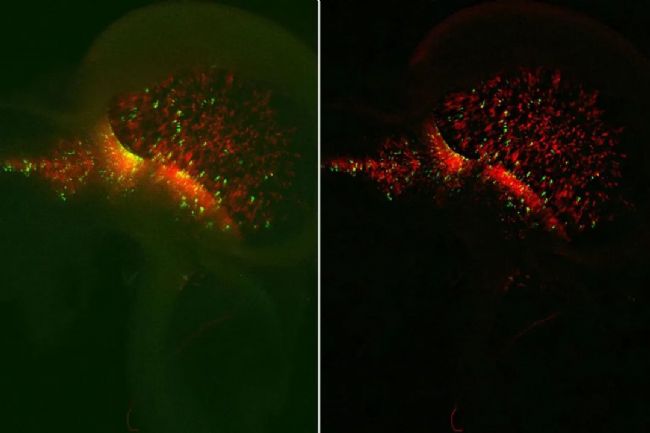 圖1:mScarlet RFP和音猬因子調(diào)控的EGFP標(biāo)記的神經(jīng)祖細(xì)胞雞胚腦圖像:A) Computational clearing處理前的原始寬場(chǎng)EDoF結(jié)果;B)SVCC處理后的結(jié)果。圖片來源:Timothy Sanders醫(yī)學(xué)博士兼哲學(xué)博士,美國(guó)芝加哥大學(xué)格羅斯曼神經(jīng)科學(xué)、定量生物學(xué)和人類行為研究所。