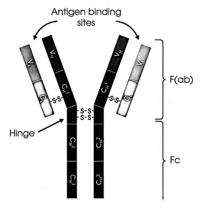 抗體以一個或者多個 Y 形單體存在,每個 Y 形單體由 4 條多肽鏈組成。每個 Y 形單體包含兩條相同的重鏈(H)和兩條相同的輕鏈(L),重鏈和輕鏈的序列和長度不同。Y 形單體的頂部包含可變區(qū)(V),也稱抗原結(jié)合片段(F(ab))區(qū)。該區(qū)可與給定抗原上的表位特異性緊密結(jié)合。