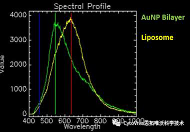 | 圖1:負(fù)載AuNP的雙層脂質(zhì)體 | 圖2:脂質(zhì)體面積(黃色)和帶有AuNPs的脂質(zhì)體雙層面積(綠色)的光譜響應(yīng) |