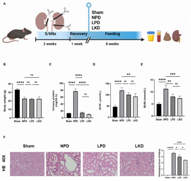 膳食結(jié)構(gòu)的組成和變化對腸道菌群的結(jié)構(gòu)和代謝有著深遠的影響。結(jié)腸是大多數(shù)腸道菌群生長和代謝的地方,盡管5-10%的膳食氨基酸會到達結(jié)腸,但許多膳食微生物組研究通常集中在膳食纖維、脂肪和碳水化合物的影響上。關(guān)于膳食蛋白質(zhì)對CKD腸道菌群和代謝的具體影響知之甚少。代謝組學分享,LKD是CKD治療的基石,而LKD-微生物代謝相互作用在CKD發(fā)病和治療中的機制作用仍不清楚。因此,作者對5/6腎次全切除術(shù)(5/6Nx)誘導的CKD小鼠采用不同的喂養(yǎng)方法,探討了LKD和LPD對腸道菌群和糞便代謝的影響。