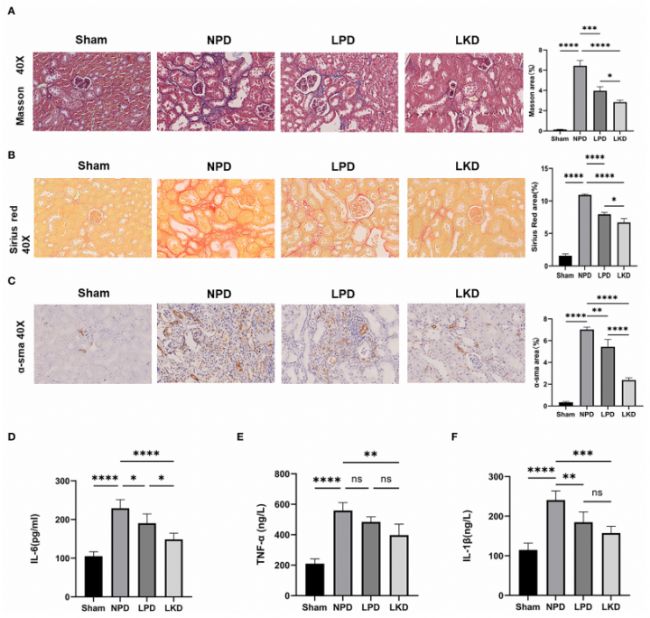 LKD改善5/6Nx小鼠的腎纖維化和炎癥 為了進一步驗證LKD和LPD是否可以延緩5/6Nx誘導的腎功能衰竭的發(fā)展,作者進行了Masson、Sirius red染色和α-SMA抗體的免疫組織化學觀察CKD小鼠的腎纖維化程度(圖2A-C)。結(jié)果表明,LKD和LPD顯著改善了CKD小鼠的纖維化程度,尤其是LKD。代謝組學分享,由于CKD通常伴有微炎癥狀態(tài),作者檢測了血清中的三種炎癥因子(IL-6、TNF-α和IL-1β)以評估炎癥水平(圖2D-F)。與Sham組相比,NPD組的IL-6、TNF-α和IL-1β均顯著增加,表明微炎癥狀態(tài)。與NPD組相比,LPD和LKD的IL-6、TNF-α和IL-1β均顯著降低。此外,LKD組中的IL-6顯著低于LPD組,表明LKD組具有更好的抗炎能力。