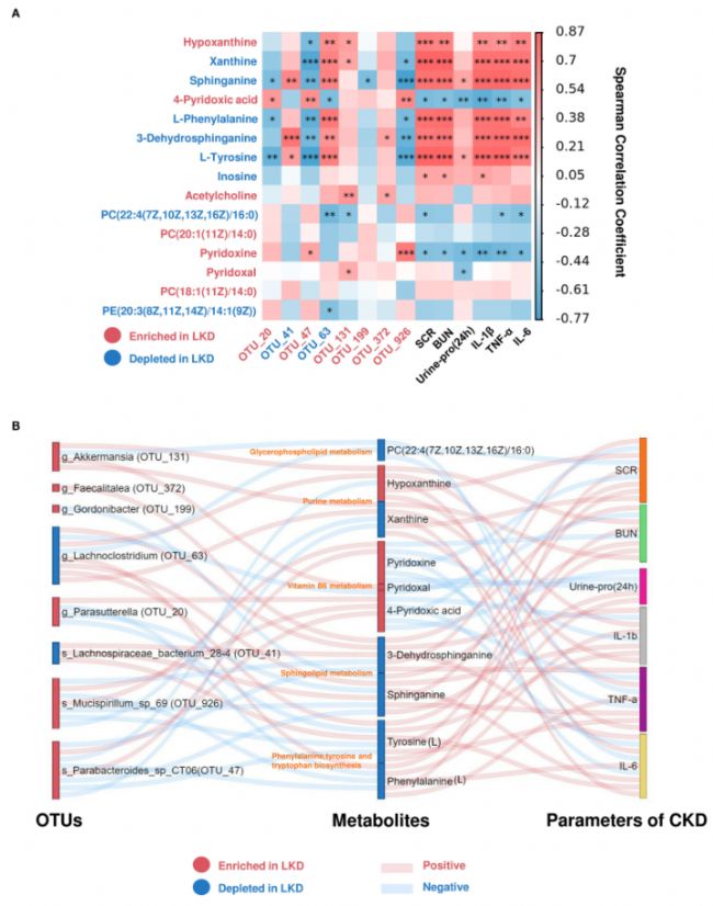 (4)參與甘油磷脂、嘌呤、維生素B6、鞘脂、苯丙氨酸、酪氨酸和色氨酸生物合成的特定代謝物以及與LKD相關(guān)的微生物與CKD的改善相關(guān)。