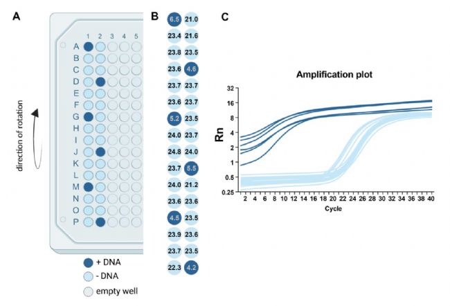A) 384孔板中純化方案的布局。前兩列是磁珠和細(xì)胞裂解物的混合物(+DNA)或磁珠和水的混合物(-DNA)。B) qPCR擴(kuò)增后獲得的每個(gè)孔的循環(huán)閾值。C) 表示在擴(kuò)增周期內(nèi)每個(gè)樣本的Rn值(normalized reporter value)擴(kuò)增曲線。