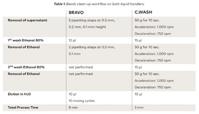 - C.WASH整個(gè)清洗過程只需要2分鐘的時(shí)間,相比BRAVO,C.WASH能更進(jìn)一步加快NGS文庫制備工作流程(表1)。