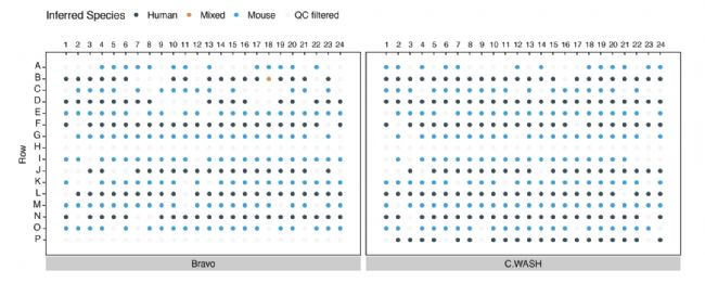 將HEK293FT(人類)和NIH3T3(小鼠)細(xì)胞經(jīng)FACS分選后,交替鋪到384孔板上,中間一行(H)作為陰性對(duì)照,如圖4所示。經(jīng)Smart-seq3儀器合成和擴(kuò)增cDNA后,分別使用C.WASH和另外一種液體處理儀器BRAVO對(duì)磁珠進(jìn)行清洗,并對(duì)比清洗效果。