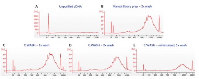 SMART-seq2文庫制備后,分別對(duì)未純化的cDNA進(jìn)行手工清洗和使用C.WASH清洗,然后通過生物分析儀檢測對(duì)比結(jié)果。
