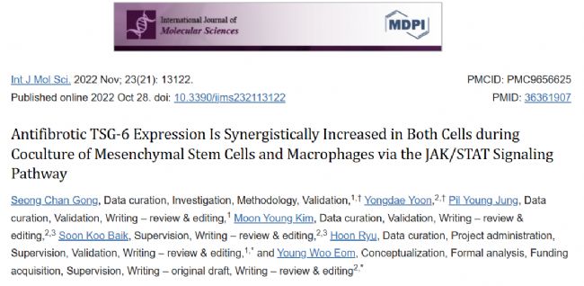 參考文獻:Gong SC, Yoon Y, Jung PY, Kim MY, Baik SK, Ryu H, Eom YW. Antifibrotic TSG-6 Expression Is Synergistically Increased in Both Cells during Coculture of Mesenchymal Stem Cells and Macrophages via the JAK/STAT Signaling Pathway. Int J Mol Sci. 2022 Oct 28;23(21):13122. doi: 10.3390/ijms232113122. PMID: 36361907; PMCID: PMC9656625.