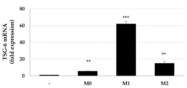 由于MSCs在炎癥環(huán)境中誘導TSG-6表達,因此研究了MSCs中的TSG-6表達是否因巨噬細胞的轉換狀態(tài)而不同。ASCs單獨培養(yǎng)或與巨噬細胞共培養(yǎng),并分別用IFN-γ和LPS或IL-4和IL-13處理,它們分別促進巨噬細胞向M1或M2表型的轉變,然后分析TSG-6表達。結果表明,無論巨噬細胞轉化狀態(tài)如何,都會增加ASCs中的TSG-6表達。M0 和 M2 巨噬細胞分別使 TSG-6 表達增加了 5 倍和 15 倍,而 M1 巨噬細胞顯著增加了 ASCs 中的 TSG-6 表達約 62 倍(圖1)。這些結果表明,與巨噬細胞共培養(yǎng)增加了ASCs中TSG-6的表達,并且M1巨噬細胞或促炎性條件可能在ASCs的TSG-6表達中起特別重要的作用。