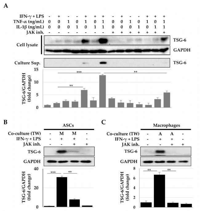 圖3 JAK抑制劑抑制TSG-6表達。在細胞因子處理或共培養(yǎng)前20分鐘用JAK抑制劑(JAK1和JAK2抑制劑各10μM)處理細胞。刺激后48 h回收細胞裂解物,并使用免疫印跡分析TSG-6表達。(A)用TNF-α,IL-1β和/或IFN-γ + LPS處理后ASCs中的TSG-6表達。共培養(yǎng)后ASCs(B)或巨噬細胞(C)中的TSG-6表達。