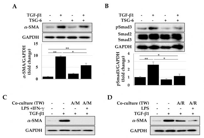 (A)TSG-6在TGF-β處理的LX-2細胞中抑制α-SMA表達。(B)TSG-6抑制Smad3磷酸化。下室中的LX-2細胞與接種在上室的ASCs和巨噬細胞共培養(yǎng)。抑制α-SMA的表達在與ASCs和巨噬細胞共培養(yǎng)的LX-2細胞中(C)或ASCs和RAW 264.7巨噬細胞中(D)。