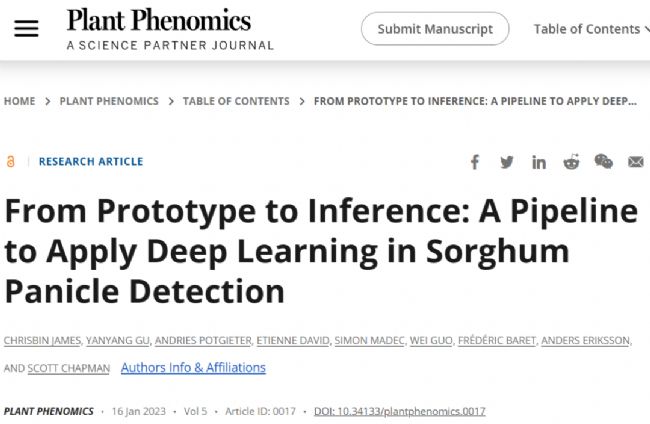 2023年1月,Plant Phenomics在線(xiàn)發(fā)表了The University of Queensland題為From Prototype to Inference: A Pipeline to Apply Deep Learning in Sorghum Panicle Detection 的研究論文。