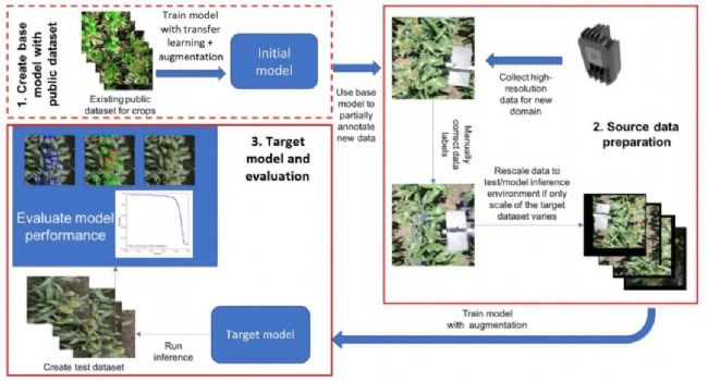 對(duì)于高粱這類(lèi)在產(chǎn)生不同分蘗數(shù)的作物,穗的密度是了解作物產(chǎn)量的主要組成部分。在植物育種和商業(yè)作物的農(nóng)學(xué)研究中,利用穗密度通常依賴(lài)于人工計(jì)數(shù)觀察,這是一個(gè)低效和繁瑣的過(guò)程。在目前的研究中,作物的RGB圖像是十分容易被采集的,因此可以基于RGB圖像利用機(jī)器學(xué)習(xí)方法以取代人工計(jì)數(shù)。然而,這些研究主要集中在有限的測(cè)試條件下的檢測(cè)本身,并沒(méi)有提供使用基于深度學(xué)習(xí)的計(jì)數(shù)的通用協(xié)議。本研究所研發(fā)的系統(tǒng)提供了從數(shù)據(jù)收集和模型訓(xùn)練到商業(yè)領(lǐng)域的模型驗(yàn)證和模型部署的基礎(chǔ),準(zhǔn)確的模型訓(xùn)練是研發(fā)生產(chǎn)系統(tǒng)的基礎(chǔ)。然而,在自然環(huán)境中,部署數(shù)據(jù)集經(jīng)常不同于訓(xùn)練數(shù)據(jù)從而導(dǎo)致模型失敗,因此一個(gè)豐富的模型對(duì)于建立一個(gè)可靠的解決方案至關(guān)重要。