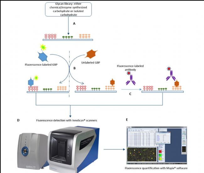 典型的聚糖陣列分析如圖 1 所示 : A) 使用微陣列點(diǎn)樣儀將聚糖或凝集素固定在功能化玻璃載玻片上。固定通過(guò)共價(jià)結(jié)合或吸附,具體取決于基片表面性質(zhì)。 B) 聚糖結(jié)合分子(GBP、病毒、細(xì)胞或其他分子)與微陣列芯片孵育。 聚糖結(jié)合蛋白和聚糖之間的相互作用通過(guò)熒光染料檢測(cè), 聚糖結(jié)合蛋白在孵育步驟之前與熒光基團(tuán)偶聯(lián),或者一旦孵育步驟完成后,加入針對(duì)聚糖結(jié)合分子的熒光標(biāo)記抗體進(jìn)行檢測(cè)( C)。D)微陣列掃描儀用于檢測(cè)熒光信號(hào)。 InnoScan掃描儀是自動(dòng)化熒光檢測(cè)的理想工具,能夠同時(shí)檢測(cè)兩種或三種熒光染料。 E) 然后使用 Mapix 軟件對(duì)圖像進(jìn)行分析以量化熒光信號(hào),該軟件與掃描儀配合使用確保熒光量化分析的自動(dòng)化。