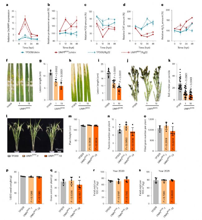 此外作者還發(fā)現(xiàn)轉(zhuǎn)入UMP1R2115基因的TP309水稻和正常的TP309水稻,在植物形態(tài)、產(chǎn)量上均相當(dāng),即UMP1R2115的轉(zhuǎn)入既具有病菌的廣譜抗性亦不影響水稻產(chǎn)量(圖4l-4s)。