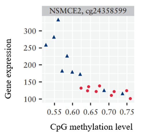 - 同一樣本/組別內(nèi),所有基因的表達(dá)水平與對(duì)應(yīng)基因的甲基化水平進(jìn)行關(guān)聯(lián)。
