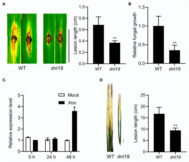 dnl19突變體對稻瘟病和水稻黃單胞菌的抗性發(fā)生改變