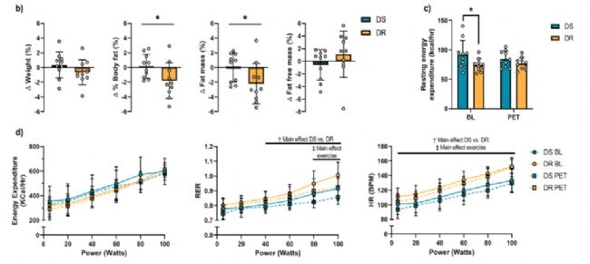 上圖c),與DS肥胖女性相比,DR女性在BL階段的靜息能量消耗較低,但PET階段不顯著;上圖d),當使用分級運動進行評估時,DS和DR肥胖女性在運動期間的能量消耗沒有差異,然而,在整個運動測試中,DR女性在更大的活動量(40W)下具有更高的呼吸交換比(RER),并且具有更高的心率(HR)。運動訓練降低了兩組的RER和HR(n=10)。