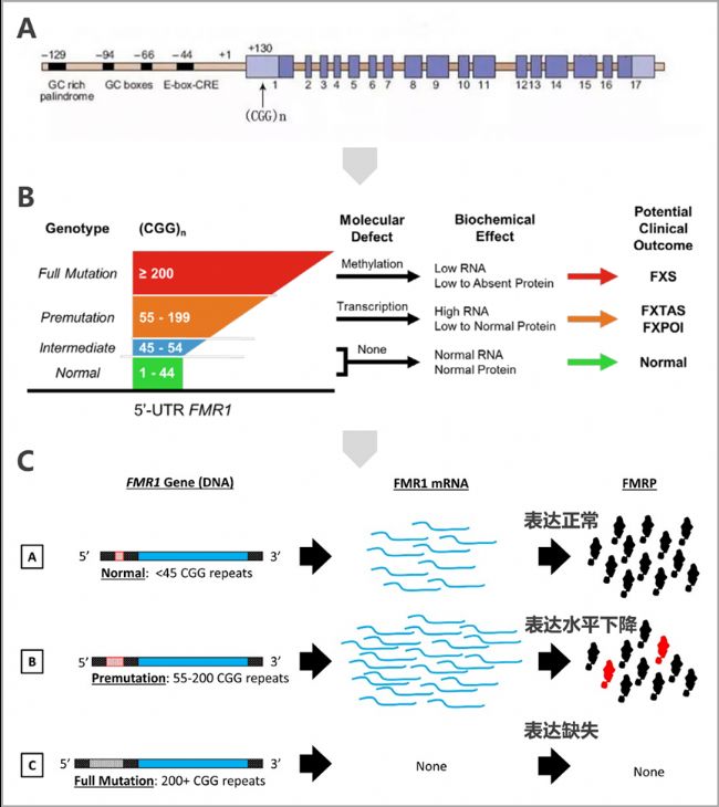 (C) CGG重復擴增到整個突變范圍(200+重復)導致FMR1基因的高甲基化,導致轉(zhuǎn)錄和翻譯的完全沉默,F(xiàn)MRP蛋白缺失。