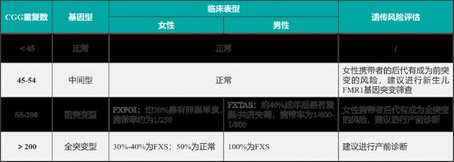 (2)中間突變型和前突變型:FMR1中間和前突變攜帶者的重復數(shù)分別在45-54和55-200之間,與正常個體相比,F(xiàn)MRP蛋白水平下降。中間和前突變增加了這些攜帶者發(fā)展為男性的FXTAS(脆性X相關(guān)性震顫/共濟失調(diào)綜合征)和女性的FXPOI(原發(fā)性卵巢功能不全)兩種疾病的風險和概率。在女性中,55-200個重復等位基因可能因月經(jīng)初潮缺失或卵泡過早耗竭而表現(xiàn)為FXPOI。