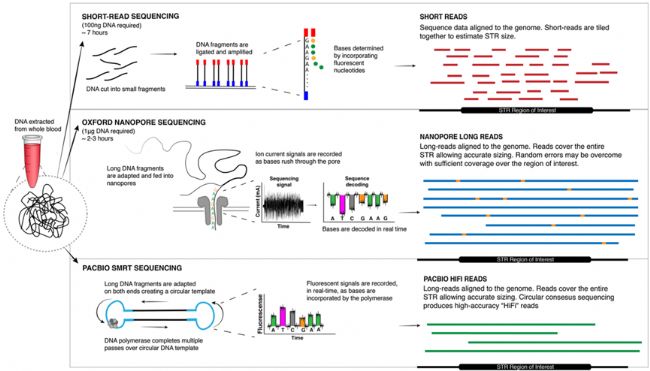 圖6. 使用短讀長NGS和兩種長讀長測序方法進行STR擴增檢測:NGS技術(shù)的短讀長度(~300bp)不足以跨越大的STR區(qū)域,因此無法精確確定其長度。長讀段很容易跨越重復和側(cè)翼區(qū)域,可精準的確定串聯(lián)重復單元的次數(shù)。納米孔測序的高錯誤率可以通過足夠的覆蓋深度來克服
