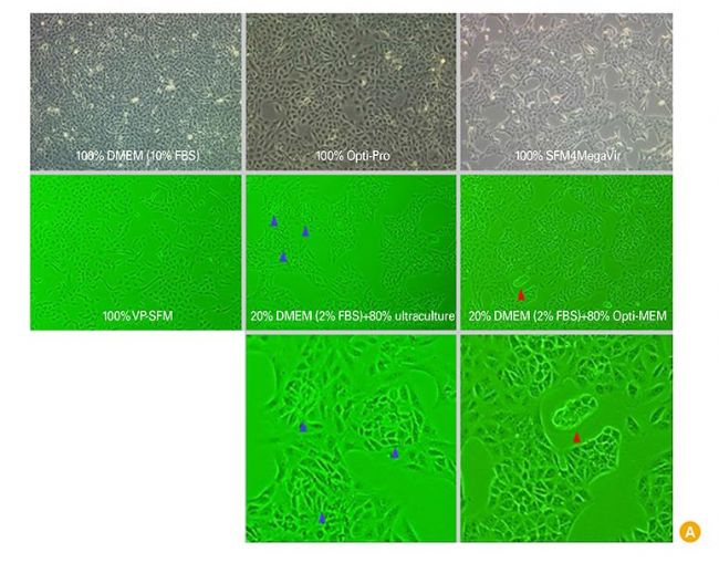 (A) 在無血清條件下生長的 Vero 細胞形態(tài)。藍色和紅色箭頭代表異常的細胞生長。(B) 與在含有 10% FBS 的 DMEM 中培養(yǎng)的細胞(對照;藍線)相比,在無血清條件下培養(yǎng)的細胞的生長速率。DMEM,Dulbecco 改良的 Eagles 培養(yǎng)基;FBS,胎牛血清。