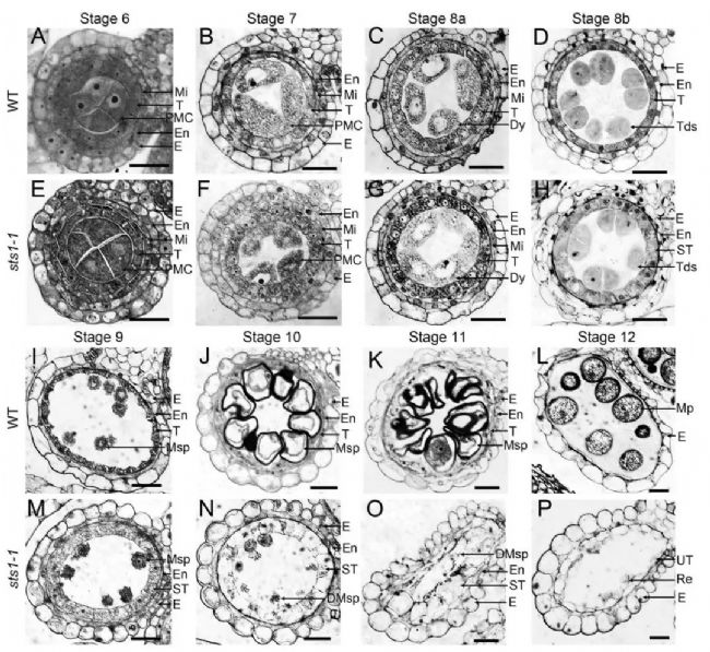 通過STS1的克隆和功能驗證實驗證實了STS1在維持雄性育性中的關(guān)鍵作用。為了進一步了解STS1在雄性生殖中的作用,作者分析比較了WT和sts1-1之間花藥發(fā)育的細胞學差異。光學顯微鏡研究發(fā)現(xiàn)在階段8a之前,WT和sts1-1之間未發(fā)現(xiàn)明顯的差異。WT在第8b階段時絨氈層開始凝結(jié),隨后進一步降解,并最終在第12階段消失。而突變體則開始表現(xiàn)出輕微腫脹,并隨著時間的延長而持續(xù)腫脹。在第12階段時,不完全降解的絨氈層則保留在突變體花藥壁中。盡管突變體的減數(shù)分裂正常,但小孢子在后期逐漸破碎。在第12階段時,WT小孢子最終發(fā)育成充滿內(nèi)含物的成熟花粉粒。相反,突變體小孢子開始塌陷和退化,最終留下空花藥室。作者后續(xù)使用透射電子顯微鏡(TEM)和掃描電子顯微鏡(SEM)觀察了絨氈層和小孢子的超微結(jié)構(gòu)和發(fā)育情況,與光學顯微鏡的結(jié)果類似,結(jié)果表明STS1對于絨氈層發(fā)育和花粉壁的形成是必不可少的(圖2)。