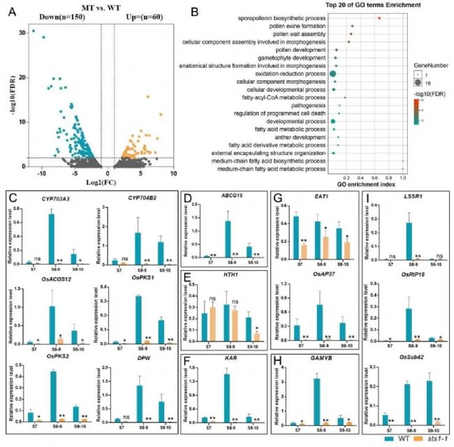 作者使用轉(zhuǎn)錄組學技術(shù)進一步了解STS1在花粉發(fā)育中的作用。在突變體花藥中篩選出210個差異表達的基因(DEGs)。其中,60個基因上調(diào),150個基因下調(diào)。GO分析發(fā)現(xiàn)DEGs顯著富集在孢粉素生物合成、花粉外壁形成、花粉壁組裝等過程。RT-qPCR分析進一步證實了一些基因參與這些途徑,如在sts1-1花藥7到10的大多數(shù)階段中,CYP703A3、CYP704B2、OsACO12、OsPKS1、OsPKS2等顯著下調(diào)。此外,與絨氈層發(fā)育相關(guān)的基因及花藥特異性基因如EAT1、OsAP37、OsSub42等在sts1-1花藥中均下調(diào)。這些結(jié)果表明,與花藥脂質(zhì)生物合成和絨氈層發(fā)育相關(guān)的許多基因的表達在sts1-1花藥中受到干擾,證實了正常花藥發(fā)育需要STS1的假設(shè)(圖4)。