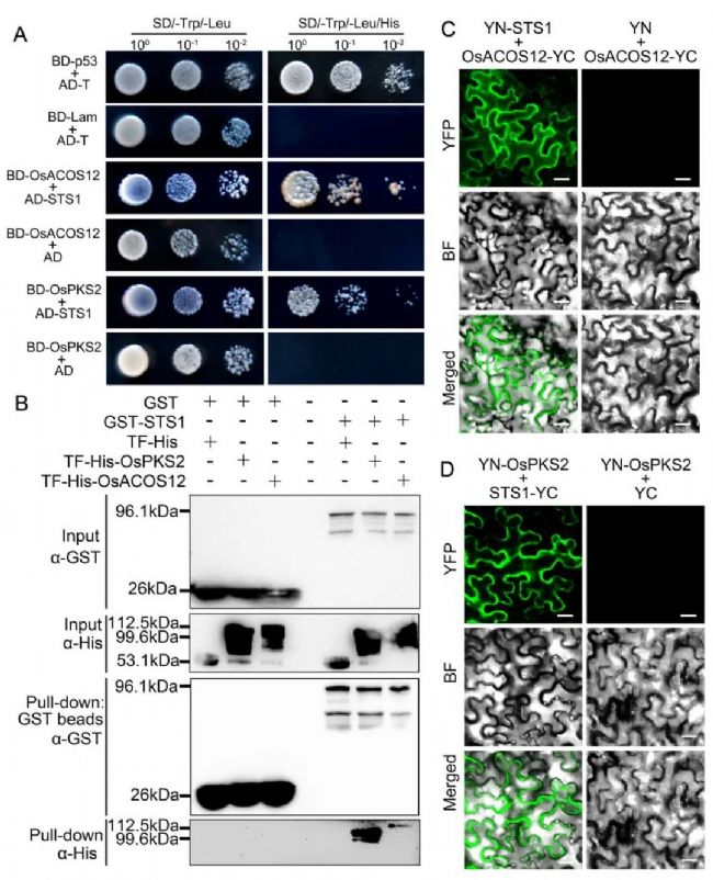 圖5 STS1與OsPKS2和OsACOS12相互作用