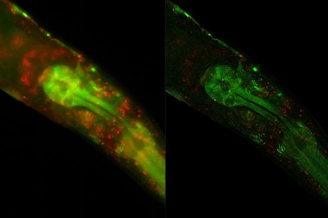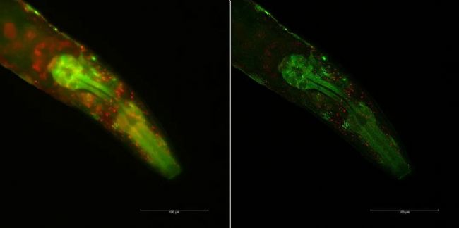 本研究中使用表達(dá)MAH215 [6]、GFP和mCherry的秀麗隱桿線蟲。MAH215是一種雙色熒光mCherry:GFP:LGG-1蛋白,其可對(duì)自噬體和自噬溶酶體進(jìn)行可視化,以監(jiān)測自噬流。GFP(綠色)表示自噬體,而mCherry(紅色)表示自噬溶酶體,后者可在酸性環(huán)境中淬滅GFP,從而導(dǎo)致發(fā)射mCherry信號(hào)。使用THUNDER Imager Model Organism對(duì)線蟲進(jìn)行成像,應(yīng)用Small volume computational clearing(SVCC)處理圖像[5],然后生成最大強(qiáng)度投影。