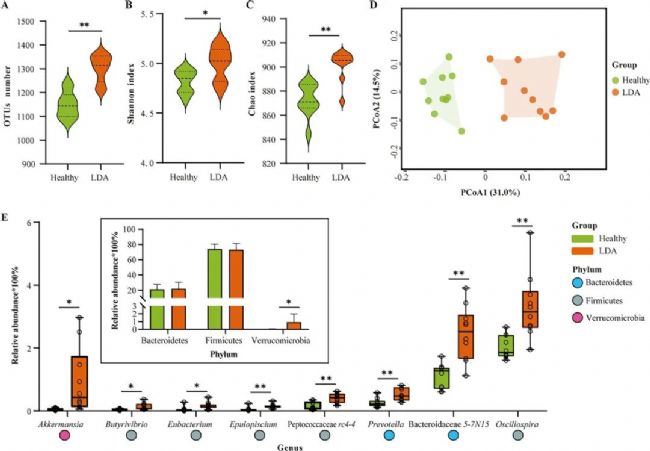 研究者先通過對健康奶牛和LDA奶牛糞便的16S rDNA測序分析鑒定其腸道微生物多樣性的變化情況。結(jié)果表明腸道菌群豐富度因LDA事件而增加,同時LDA組與健康組的糞便微生物群落明顯分離,群落異質(zhì)性結(jié)構(gòu)顯著。