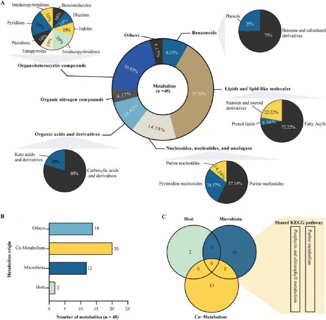 此外,糞便中鑒定出的20種差異代謝物來自宿主和腸道菌群之間的共同代謝過程。KEGG代謝通路分析顯示,微生物群之間和與宿主共代謝之間享有兩條共同通路:嘌呤代謝和卟啉-葉綠素代謝通路。
