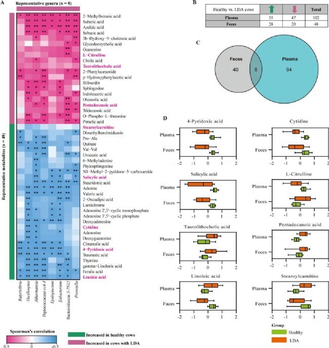 為了確定與LDA相關(guān)的代謝產(chǎn)物和腸道微生物群變化之間的相關(guān)性,研究者進行了Spearman相關(guān)性分析。Akkermansia、Oscillospira和Peptococcaceae rc4-4的豐度與糞便中鑒定出的大部分代謝物具有很強的相關(guān)性。研究者進一步將前期工作中所獲得血漿代謝物數(shù)據(jù)與糞便代謝物數(shù)據(jù)整合分析,在糞便和血漿樣本中篩選了8種共同的代謝物。結(jié)果顯示:與健康奶牛相比,LDA組共代謝的胞苷和4-吡哆酸水平下降。LDA發(fā)生期間,奶牛體內(nèi)微生物產(chǎn)生的水楊酸水平顯著降低。LDA組糞便中亞油酸和硬脂酰肉堿含量低于健康組。LDA組血漿亞油酸和硬脂酰肉堿水平顯著升高。