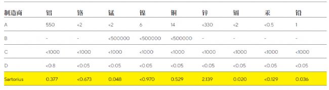 表3:賽多利斯和其他制造商移液器吸頭的微量金屬測(cè)試結(jié)果和檢測(cè)水平示例(μg/mL=ppm)