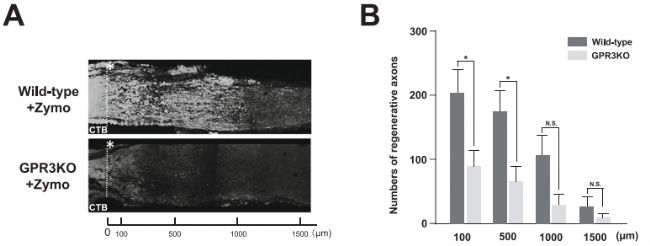 為了包裝腺相關(guān)病毒(AAV), PAAV質(zhì)粒、Rep2-Cap2質(zhì)粒和phelper質(zhì)粒使用NEPA21電轉(zhuǎn)染儀(Nepa Gene)共轉(zhuǎn)染HEK293FT細(xì)胞,從細(xì)胞和培養(yǎng)基中收集包裝好的AAV載體,然后進(jìn)行純化。為增加載體濃度,將復(fù)合材料應(yīng)用于Vivaspin色譜柱(VS2041;感染前1天,HEK293細(xì)胞以2.0 × 105個(gè)細(xì)胞/孔的比例在24孔板中培養(yǎng),以評(píng)估滴度。轉(zhuǎn)染3天后固定細(xì)胞,在熒光顯微鏡下計(jì)數(shù)gfp陽性細(xì)胞,每種AAV的效價(jià)分為三份并計(jì)算轉(zhuǎn)導(dǎo)單位(TU/ml),得到本研究使用的AAV病毒滴度:rAAV-Mock 10 × 1010 TU/ml和rAAV-GPR3 8 × 1010 TU/ml。為了評(píng)估軸突再生,6周齡雄性野生型小鼠(C57BL/6)在ONC前2周使用玻璃拉桿制成的尖尖玻璃毛細(xì)管靜脈注射1 μl rAAV-Mock或rAAV-GPR3。為了評(píng)估GPR3和酵母聚糖的聯(lián)合作用,在ONC后立即仔細(xì)地靜脈注射1 μl酵母聚糖 。陽性對(duì)照組在ONC后立即同時(shí)注射1 μl 酵母聚糖。摘除眼睛,在去核前兩天,順行示蹤劑以可視化再生的RGC軸突。然后用低溫恒溫器將固定的視網(wǎng)膜矢狀切片成14 μm厚的切片,為了評(píng)估再生軸突的數(shù)量,作者在距離粉碎部位4種不同距離處量化再生軸突的數(shù)量。對(duì)野生型或GPR3基因敲除小鼠的眼睛進(jìn)行ONC,手術(shù)后立即在眶內(nèi)給藥酵母聚糖,神經(jīng)損傷后28天用熒光順行示蹤劑評(píng)估軸突再生。結(jié)果表明,在野生型小鼠中,酵母聚糖影響軸突再生。然而,在GPR3基因敲除小鼠的視網(wǎng)膜中,酶多糖介導(dǎo)的軸突再生被顯著抑制。當(dāng)聯(lián)合酵母聚糖時(shí),GPR3在ONC后軸突再生中起作用(圖3)。