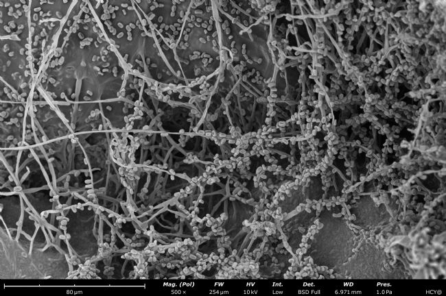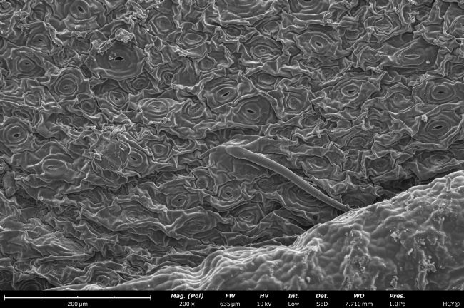 未發(fā)生霉變的茶葉,我們可以看到葉片表面有很多氣孔,有些處于張開(kāi)狀態(tài),表面沒(méi)有看到微生物附著。