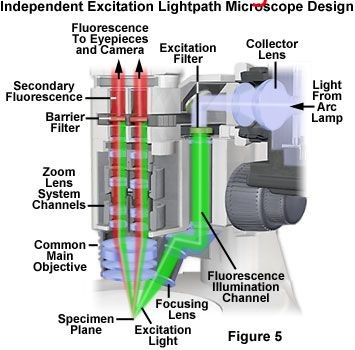 其他顯微鏡制造商有著不同的提示熒光照明設(shè)計(jì),如Figure5中為比較主流的模式之一。在這一設(shè)計(jì)中,有一個(gè)獨(dú)立于成像光路的熒光照明通道。由光源發(fā)出的光首先經(jīng)過(guò)激發(fā)光濾色片,然后通過(guò)主機(jī)后方的通道到達(dá)底部的透鏡組,這些透鏡組將光傳導(dǎo)到樣品上。這樣的設(shè)計(jì)保證了無(wú)論在何種放大倍數(shù)下,激發(fā)光都會(huì)直接照射在樣品上,范圍,發(fā)射光強(qiáng)度,黑背景都不隨放大倍數(shù)改變。發(fā)射出的熒光通過(guò)物鏡到達(dá)變倍體后,透過(guò)發(fā)射光濾光片,進(jìn)入目鏡用于觀察或進(jìn)入相機(jī)。這一設(shè)計(jì)主要的優(yōu)勢(shì)在于取消了半透半反鏡,并且濾片的組合可變,研究者可選的范圍很大。然而,這也帶來(lái)了相應(yīng)的問(wèn)題,如,沒(méi)有經(jīng)驗(yàn)的操作者可能會(huì)因?yàn)檫x擇了錯(cuò)誤濾片組合而觀察不到熒光。