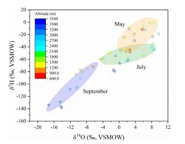 結(jié)果發(fā)現(xiàn),葉片水氫和氧同位素對(duì)氣象參數(shù)(降雨、溫度和RH)和源水(木質(zhì)水、降雨)氫和氧同位素響應(yīng)存在差異:葉片水氫同位素和源水氫同位素相關(guān)性更高(相比氧同位素);而葉片水氫和氧同位素和氣象參數(shù)相關(guān)性差異不大。另外,葉片水氫和氧同位素隨季節(jié)和海拔變化存在明顯變化,形成了著名的葉片水線(LWL)。