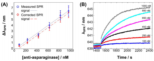 在本文中,研究者通過多角度的摸索優(yōu)化,在SPR平臺(tái)上,首次實(shí)現(xiàn)了對(duì)臨床血樣中天冬酰胺酶抗體的無稀釋檢測(cè)。雖然在針對(duì)臨床樣本檢測(cè)中還存在樣本異質(zhì)性、檢測(cè)靈敏度等挑戰(zhàn),但同時(shí)該文為疾病的預(yù)后監(jiān)測(cè)研究提供了一種新思路。